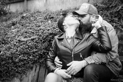 Tout d'abord, nous avons préparé la séance ensemble; il avait été défini le thème du vintage pour Aurélie et plutôt Rock pour Alex. En fait, c'est un peu comme chez le célèbre fast-food, "Venez comme vous êtes ".. Loin d'être déguisé pour l'occasion, ce petit couple n'a eu qu'à choisir dans s propre garde-robe quotidienne; rien de mieux pour se sentir à l'aise en étant soi.